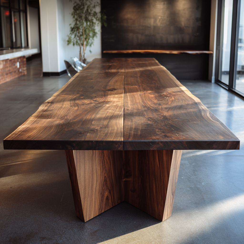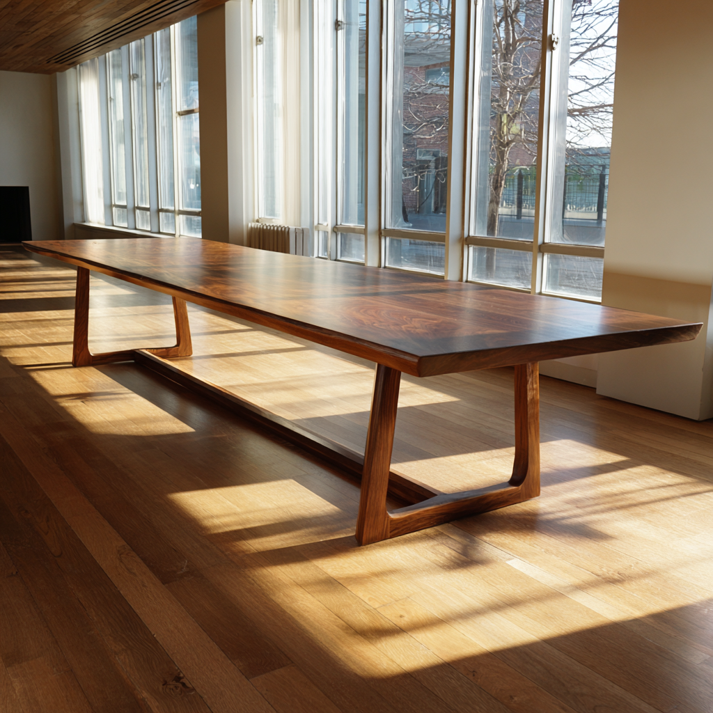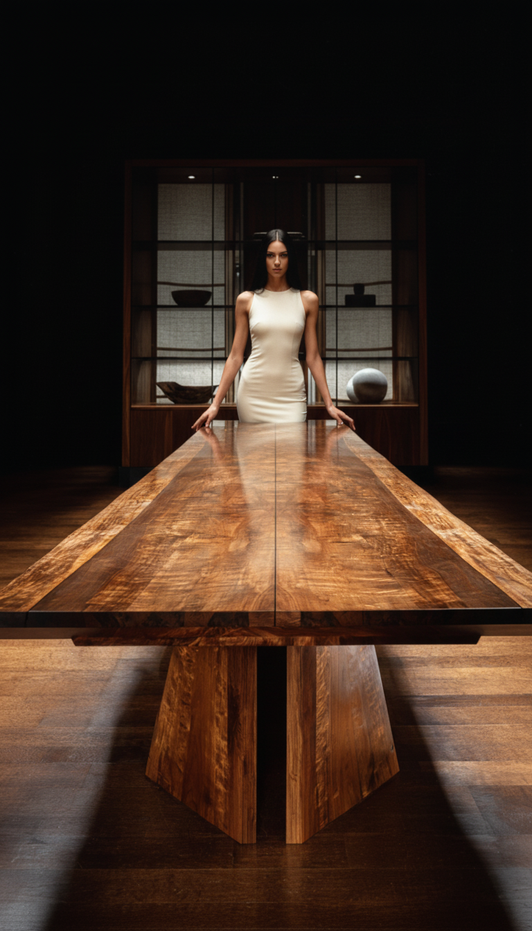 Claro walnut on a monumental scale. The table holds light and conversation with equal gravity — quiet authority carved from a single tree.