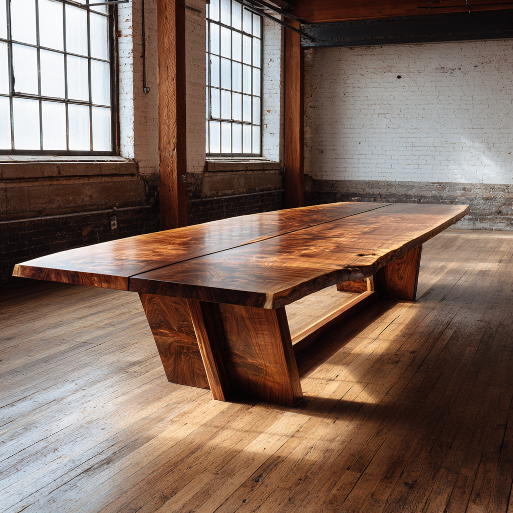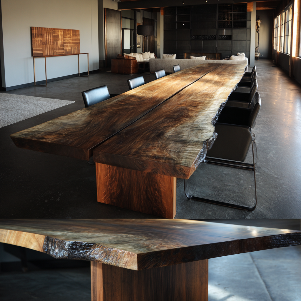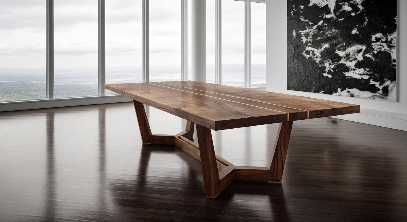 Claro walnut on a monumental scale. The table holds light and conversation with equal gravity — quiet authority carved from a single tree.