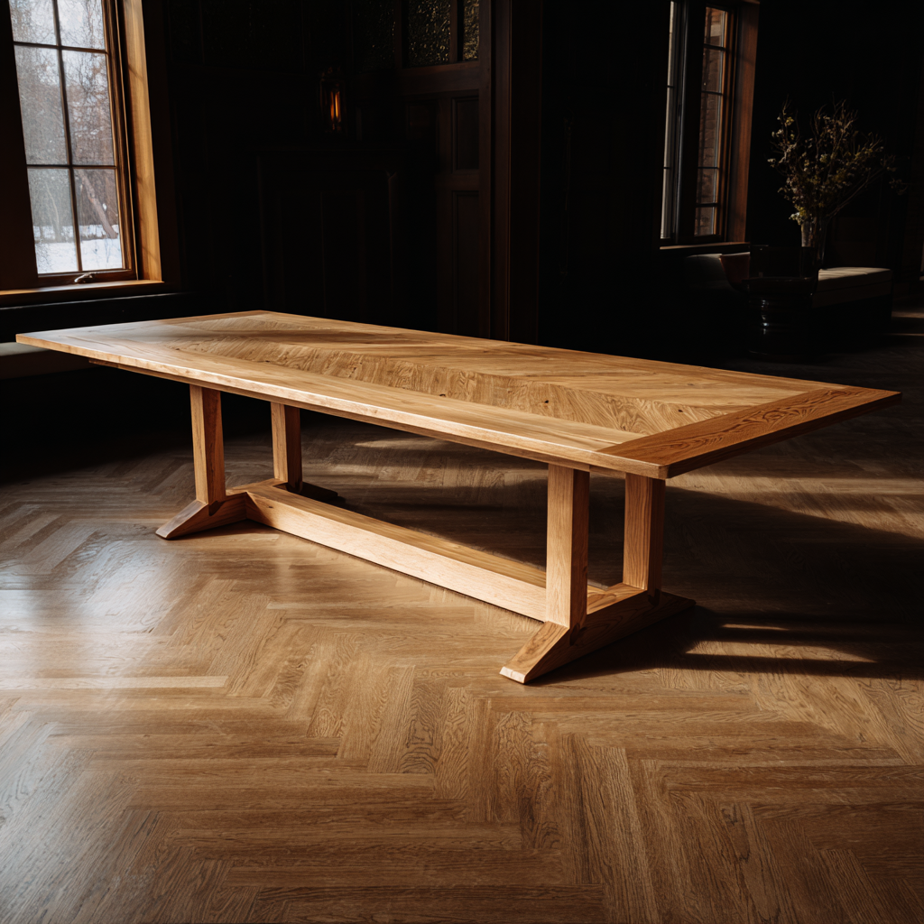 White oak with a chevron-pattern top and breadboard ends on a trestle base — a study in rhythm, restraint, and light. Each seam lines up like a chord resolving.