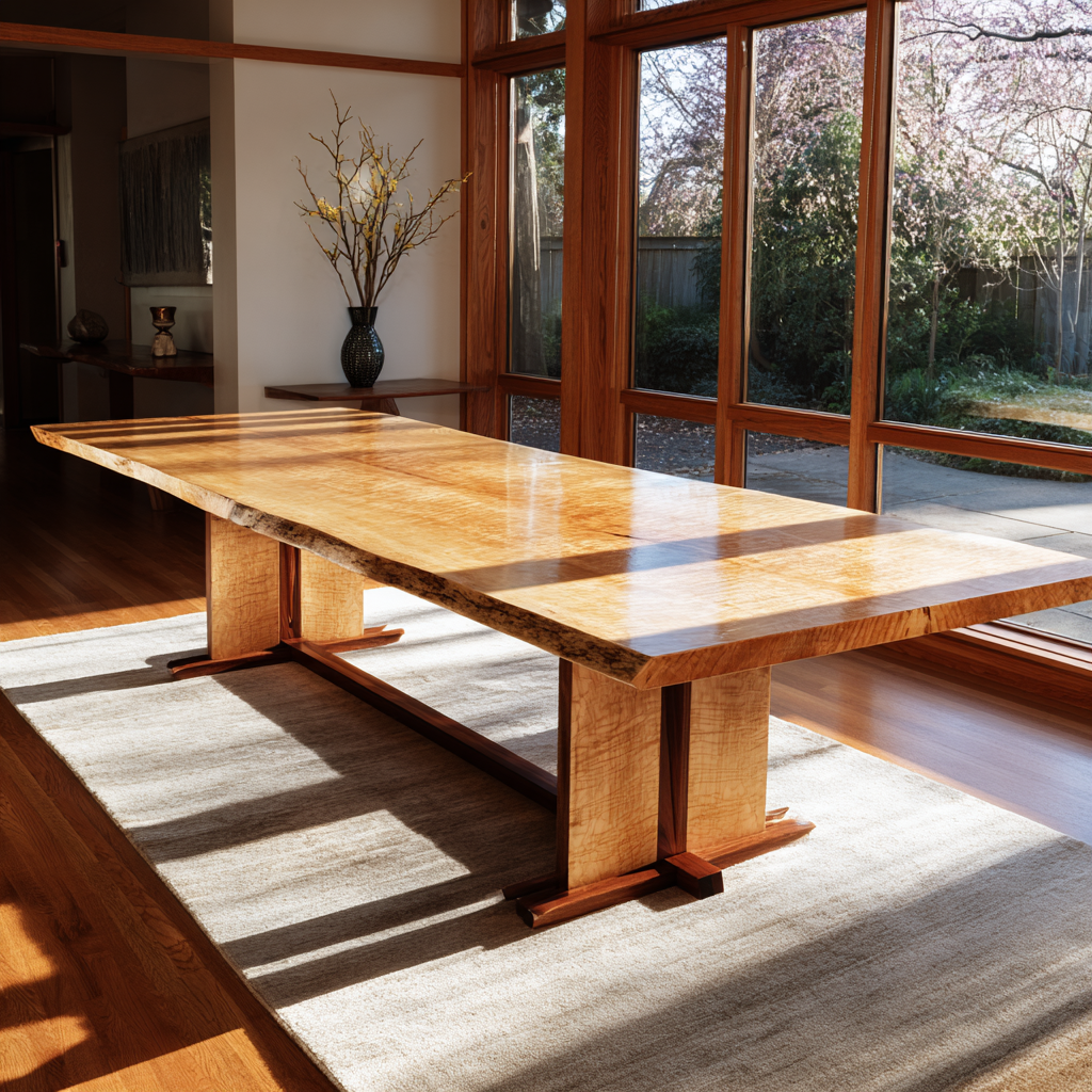 Highly figured big leaf maple on a Japanese-inspired trestle base. Organic movement above, precise joinery below — a balance of spirit and discipline.