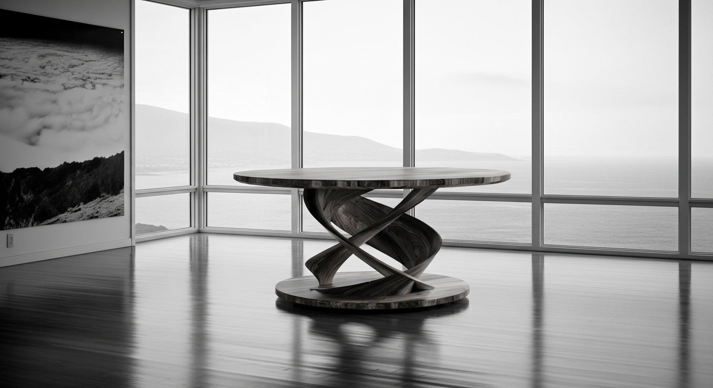 A nod to Watson & Crick: the Lani Double Helix twists two sculptural “ribbons” into a locked pedestal beneath a round top /// calm lines, uncompromising strength, elegant biology.