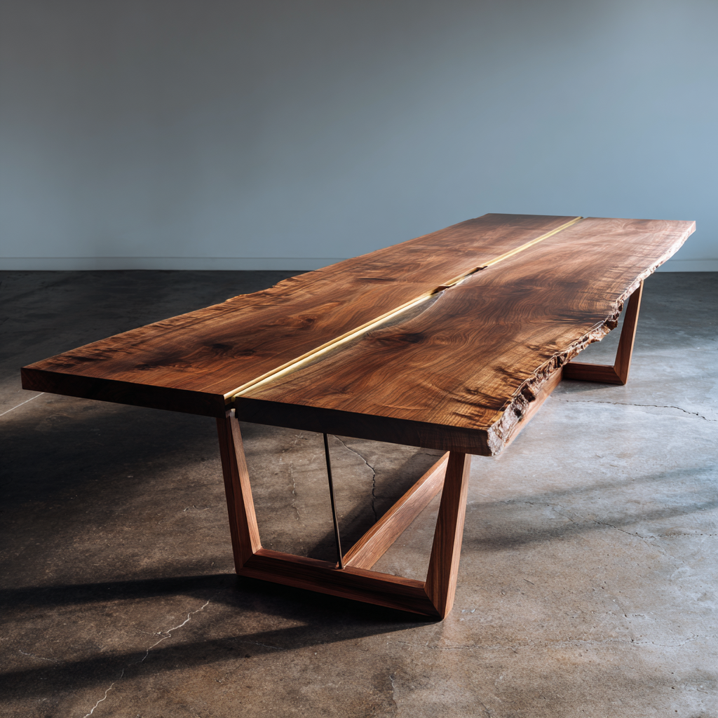 Named after the lively, sun-splashed artery that runs through San Francisco’s Mission District, the Valencia table captures the same mix of color, texture, and rhythm found on the street itself. Its bookmatched Claro Walnut slab top ripples with figure and flame, divided by a subtle inlay of solid brass that gleams like afternoon light on glass storefronts. A sculpted trestle base grounds the piece — elegant, muscular, and meant for gatherings that stretch long into the night.